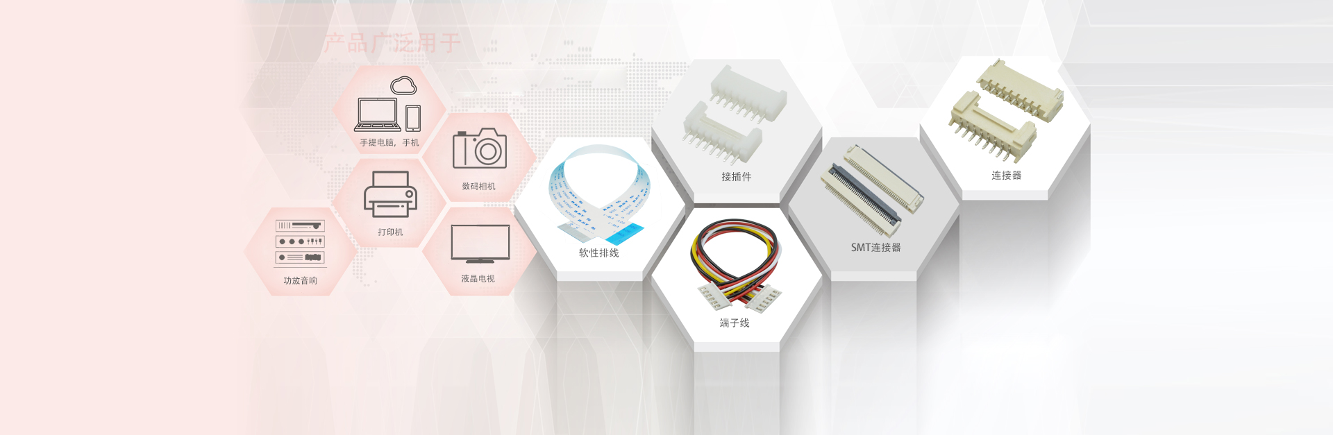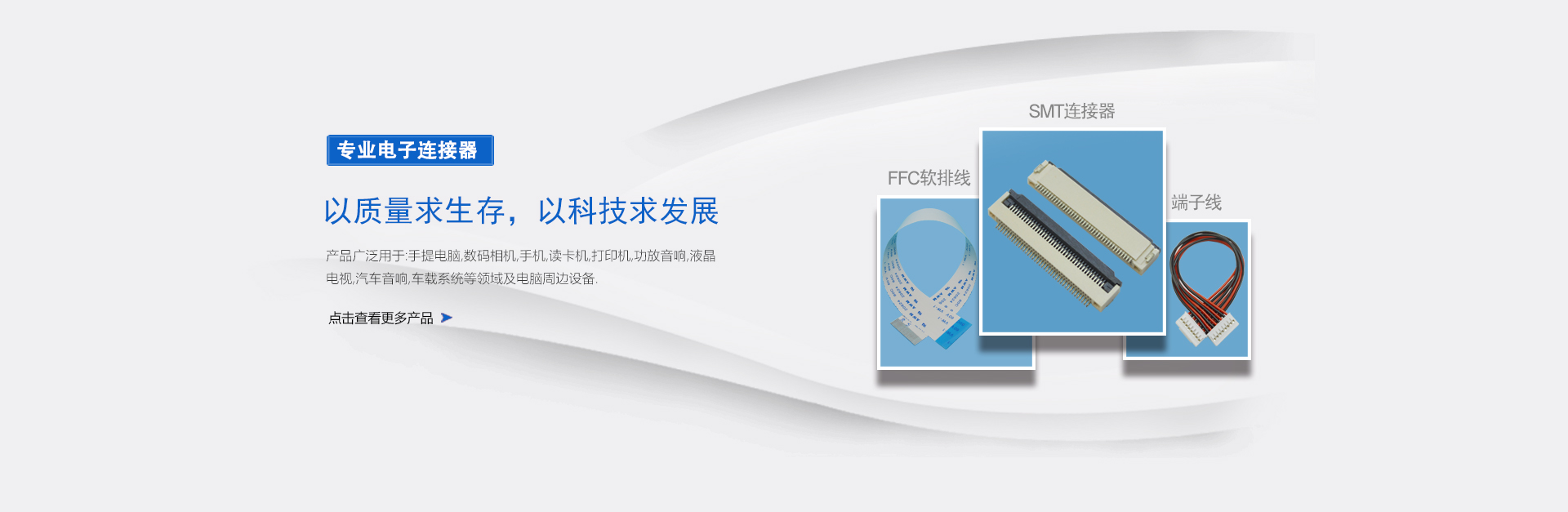 經營項目:FPC連接器、接插件、光纖連接器、FFC排線、端子線束等。間距有:0.3mm/0.5mm/0.8mm/1.0mm/1.25mm/1.5mm/2.0mm/2.54mm/3.96mm.......并可以為您開模定制各類精密連接器及配套線束.